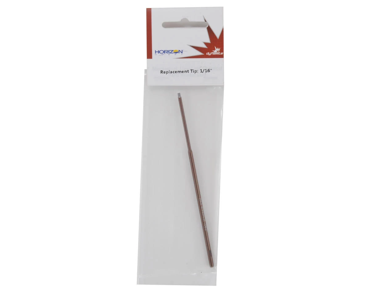 This is a replacement Dynamite 1/16 Machined Hex Driver Tip. These tips are machined from steel and feature a protective coating, with an engraved size mark on the tip for identification.