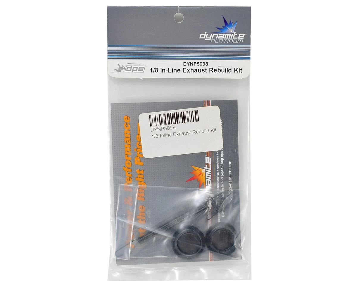 This is a replacement Dyanmite 1/8 In-Line Exhaust Rebuild Kit for .21 and .28 engines. This kit includes two gaskets, one long manifold spring and three small exhaust springs.Â