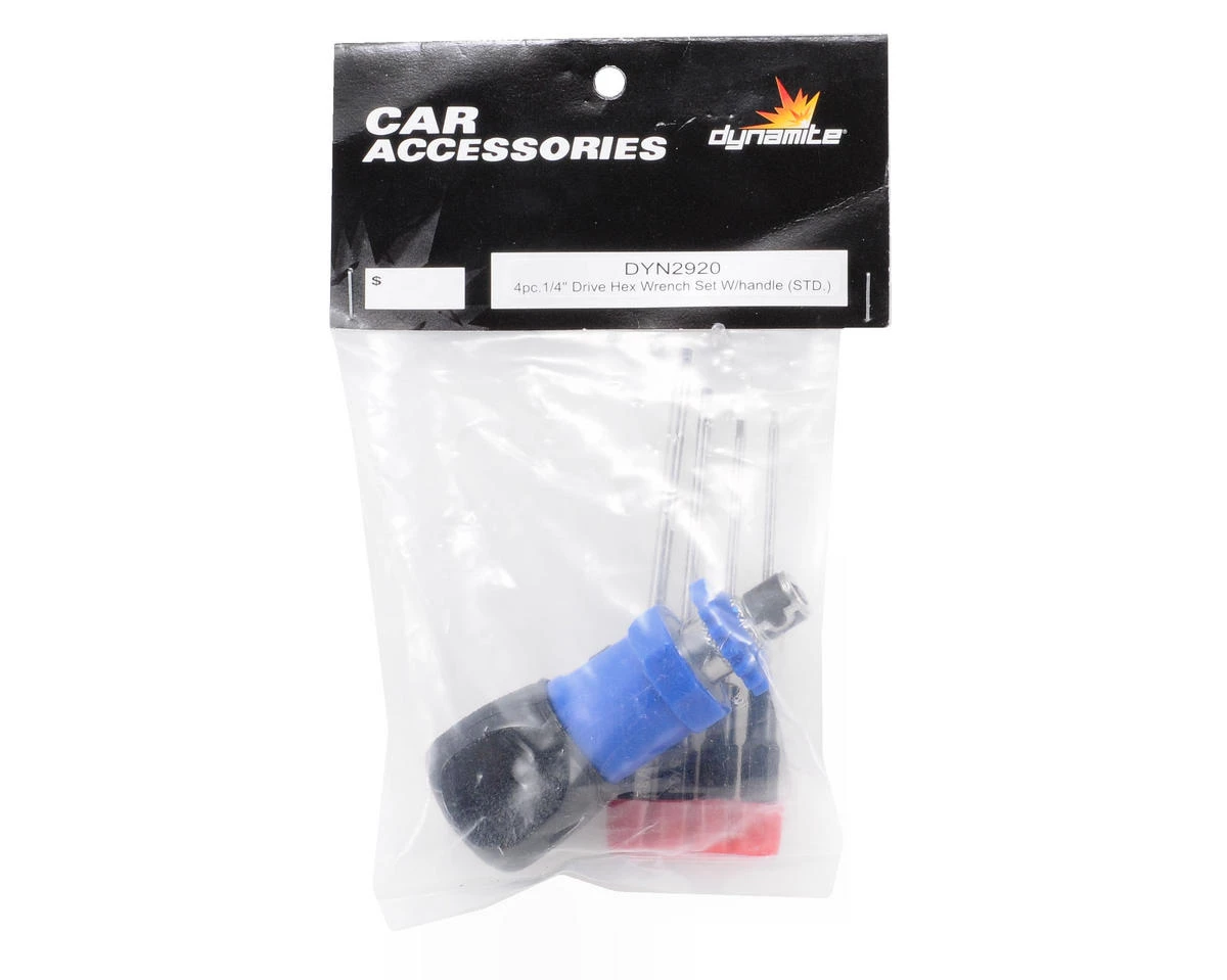 This is a Dynamite 4 Piece Standard Hex Wrench Set. This set includes .050, 1/16, 5/64 & 3/32 size tips with a 1/4″ drive that can also be used with a cordless drill. The ratchet handle features a 3 way quick release mechanism that makes wrenching easy.