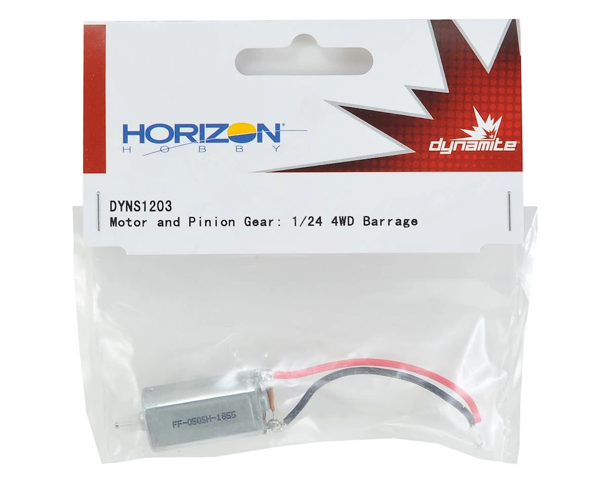 The Dynamite Barrage 1/24 Motor & Pinion Gear is a replacement for the Barrage 1/24. Package includes one motor with factory installed motor wires and pinion gear.