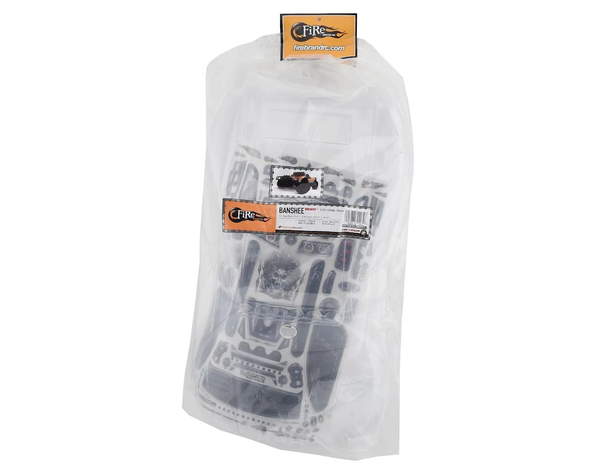 The Firebrand Banshee Short Course Body is a highly detailed, short-course racer that has a look all it’s own. A low profile stance keeps gravity centered on the chassis for less drag and more speed. It has a protective over-spray film and includes a large decal sheet and window masks. This body fits most 1:10 scale, short-course race trucks. Nitro or electric. No holes drilled. (18.75″ x 10.25″). Bodies are clear and come ready to paint.