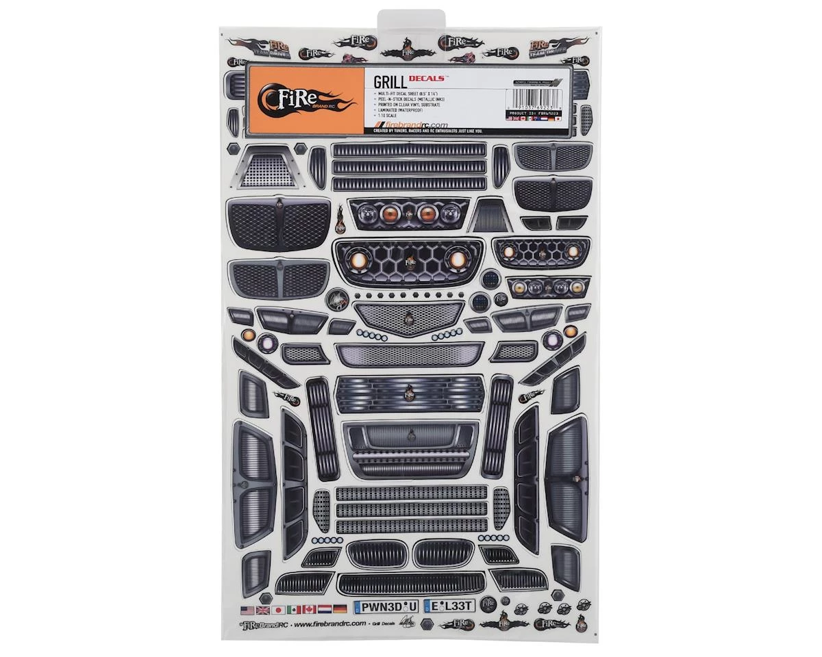 The Firebrand Grilles Multi-Fit Decal Sheet is designed to give your body a unique, “next-level” look. Exclusive, FireBrand RC Multi-fit decal sheets are designed to fit any 1:10 scale (or similar) remote-controlled car, truck, plane, helicopter or boat body.