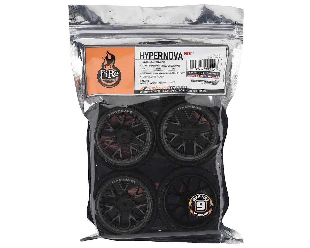 Firebrand Hypernova RT9 Pre-Mounted On-Road Tires feature HyperNova-RT9 on-road race wheels mounted to FireFangâ„¢ treaded racing tires. Both are made from the highest quality ABS plastic and rubber materials available. The FireFang tires are a low-profile and directional, medium-compound, treaded race tire option. These all-new race wheels and tires fit most 1:10 scale, on-road, radio-controlled cars. 2.0″ x 1.0″ HyperNova 9mm, “deep-dish” race wheels are available in Uzi-Metalâ„¢ and, if desired, can be painted with poly carbonate paint.