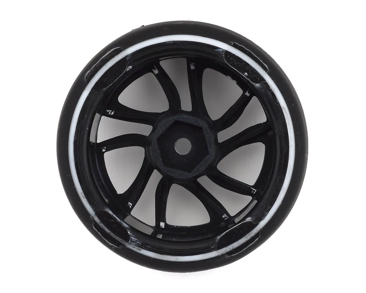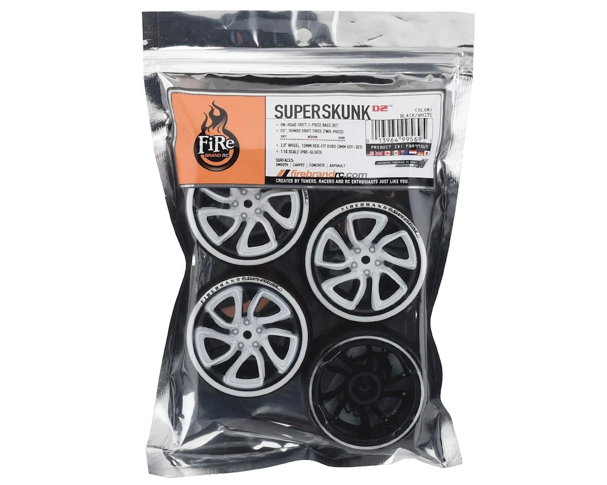 Firebrand Superskunk D2 Pre-Mounted Slick Drift Tires feature SuperSkunk on-road drift wheels mounted to D2 “white-wall” drift tires. Both are made from the highest quality ABS plastic and rubber materials available. The D2s are an ultra low-profile, low-traction, 2-piece ABS plastic-piped drift tires. These drift wheels and tires fit most 1:10 scale, on-road, radio-controlled cars. 2.0″ x 1.0″ SuperSkunk drift wheels are available in Galaxy-black with White accents and, if desired, can be painted with poly carbonate paint. 12mm hex-fit hubs w/3mm off-set.